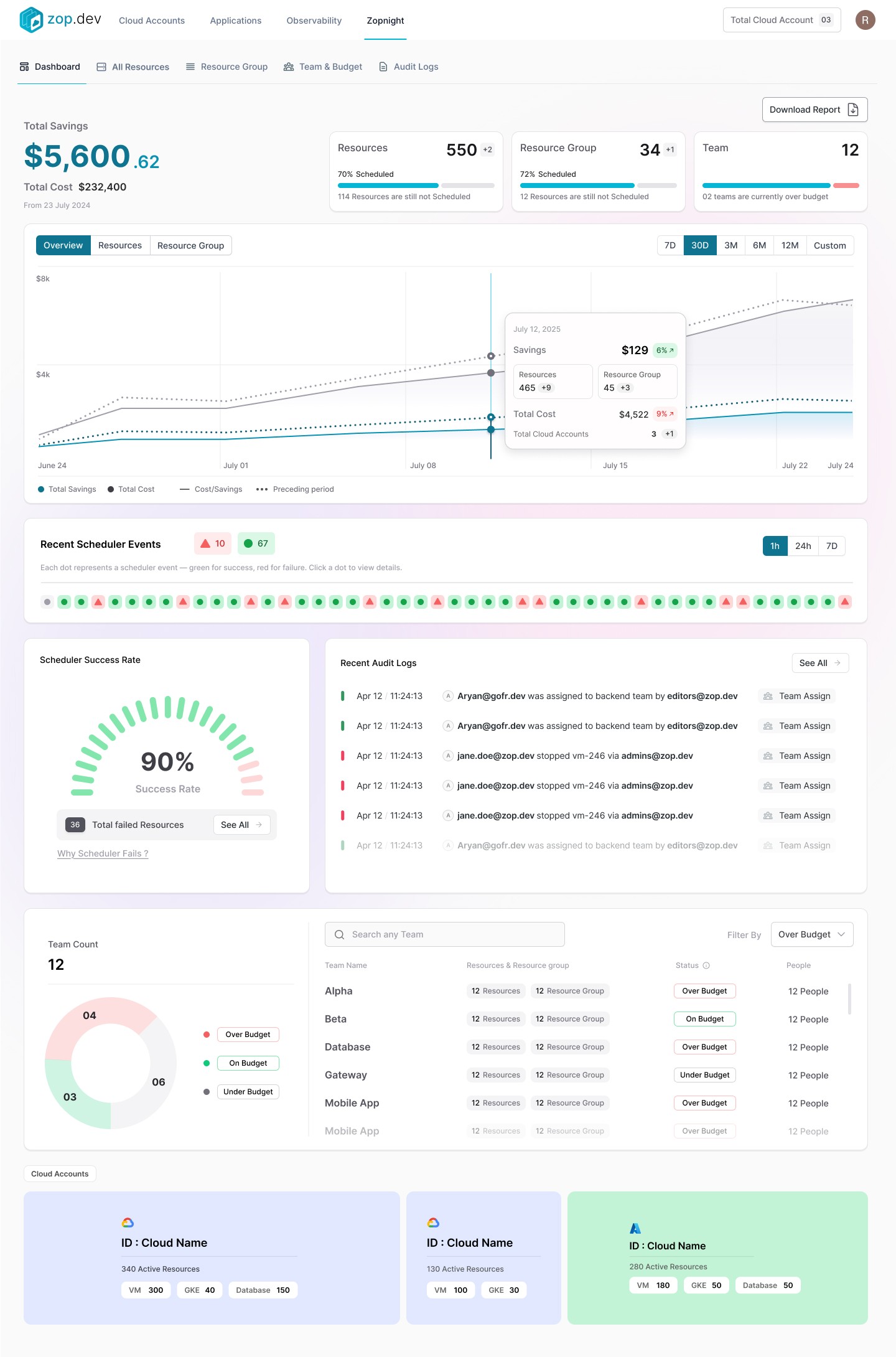 ZopDev gives your team the Internal Developer Platform (IDP) to build at top speed, and the FinOps Automation Tool to manage your cloud spend with intelligence.
